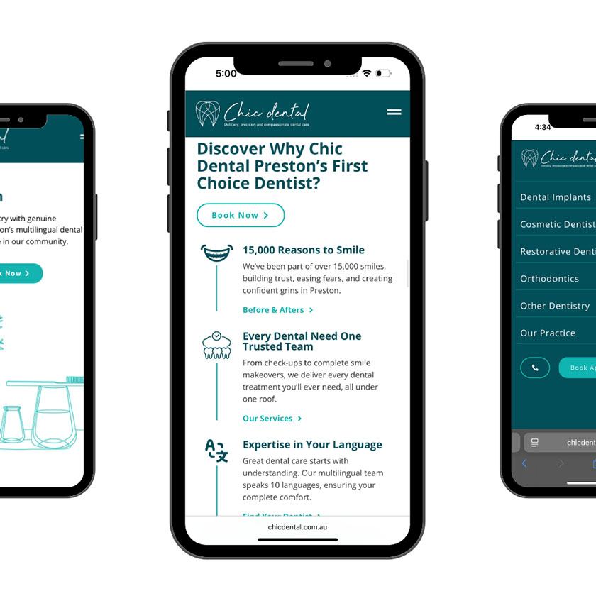 With an existing online presence that wasn’t converting visitors into patients, Chic Dental required authentic representation of all the values that made them different from corporate dental chains. This involved a modern website to help reduce dental anxiety, showcase its full range of services and make booking appointments effortless.